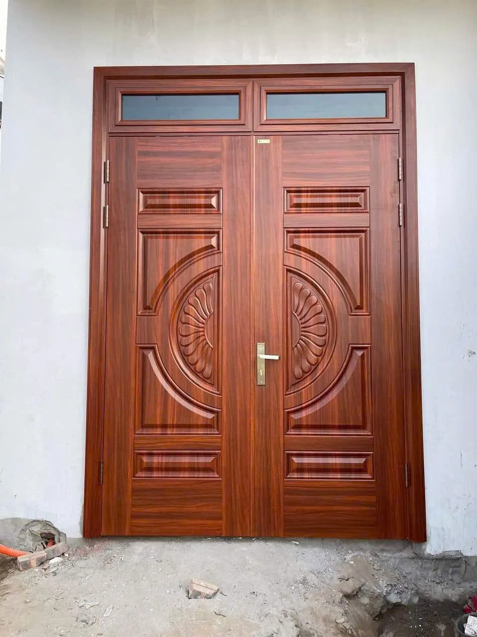 1 | Cửa Thép Vân Gỗ – Kích thước chừa tường: (2500×2850)mm – Cửa luxury 4 cánh lệch + Cánh to huỳnh 101 + cánh nhỏ kính – Trên 3 ô thoáng kính Dày tường 130 |